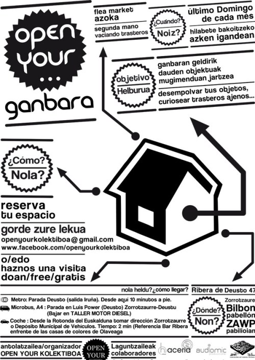 – Hileko azken igandeetan Zorrozaurre aldean, Zawp-en, ‘Open Your Kolektiboa‘-k, auzokide zein kanpotarrek geldirik daukaten guztia martxan jartzeko gonbidapena egiten du. ‘Open your kolektiboa’ kaxoiean gorderik ideia bat bera ere ez geratzea bilatzen duen ekimena da. Kolektibo honek 2009ko abenduan ospatu zuen lehenengo ‘Ganbara’, eta auzoaren dinamizazioa bilatzen zuen berarekin. Izan ere, nahiz eta aste bitartean eremuan oraindik geratzen diren industria arrastro gutxiaren martxa somatzen zen, asteburuan beraien auzoa ia hilik sentitzen zuten bertakoek. Horri erantzuna emateko ‘Open Your Ganbara‘ jaio zen, eta 2011ko maiatzerarte ospatu izan da. Egun denboraldiko etenaldia egin dutelarik.