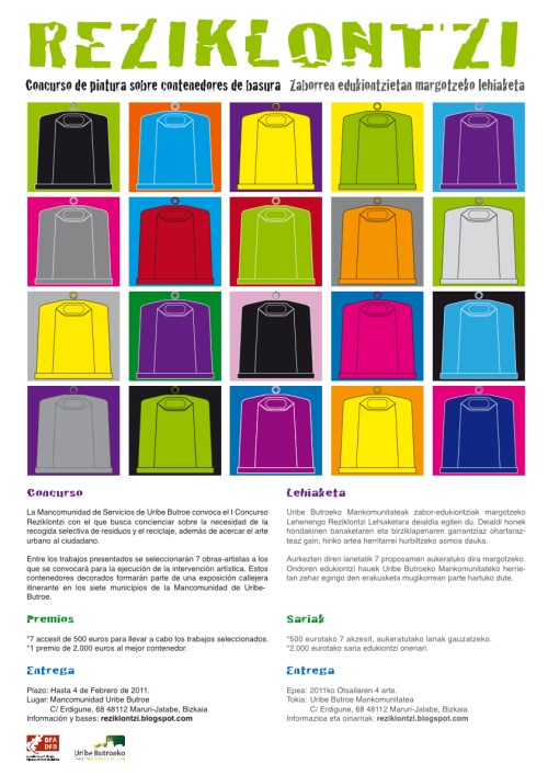 ARRIETA, FRUIZ, GAMIZ-FIKA, GATIKA, LAUKIZ, MARURI-JATABE eta MEÑAKA herriek osotzen duten Uribe Butroe Zerbitzu mankomunitateak “Reziklontzi-arte edukiontzien lehenengo lehiaketa”-ren deialdia egiten du. Ekintza honen bidez hondakinak jasotzeko sistema selektiboaren eta birziklapenaren beharraz kontzientziatu nahi du. Horrez gain herritarrei hiri-artea hurbildu nahi die.